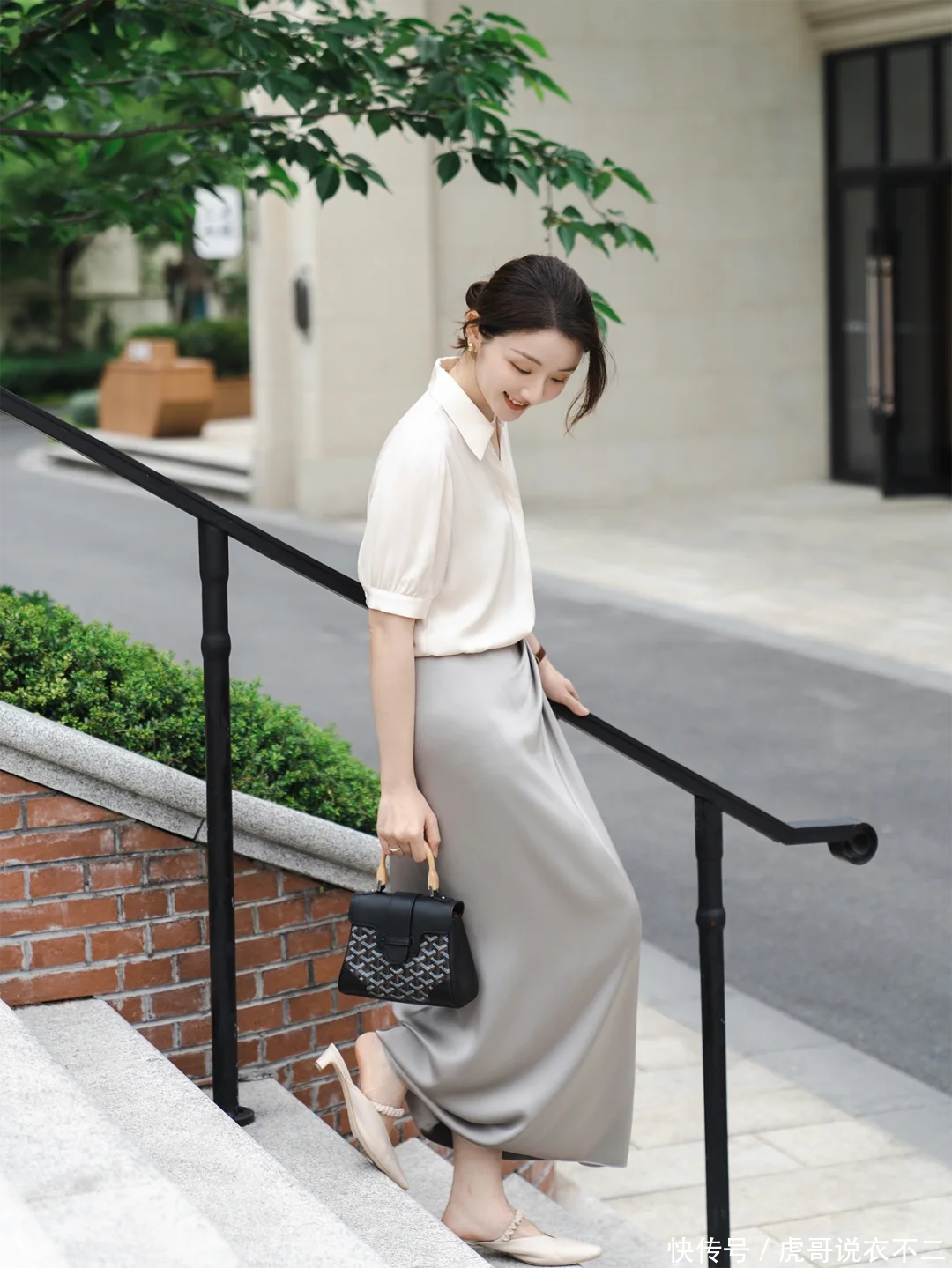 当然,如果你觉得纯白色有些单调,不妨选择一些带有小心机的设计款。比如,缎面材质的白色衬衫,袖口收紧的设计,瞬间提升了整体造型的法式情调。搭配一条银灰色缎面半身裙,米白与银灰的碰撞,既清爽又时髦。