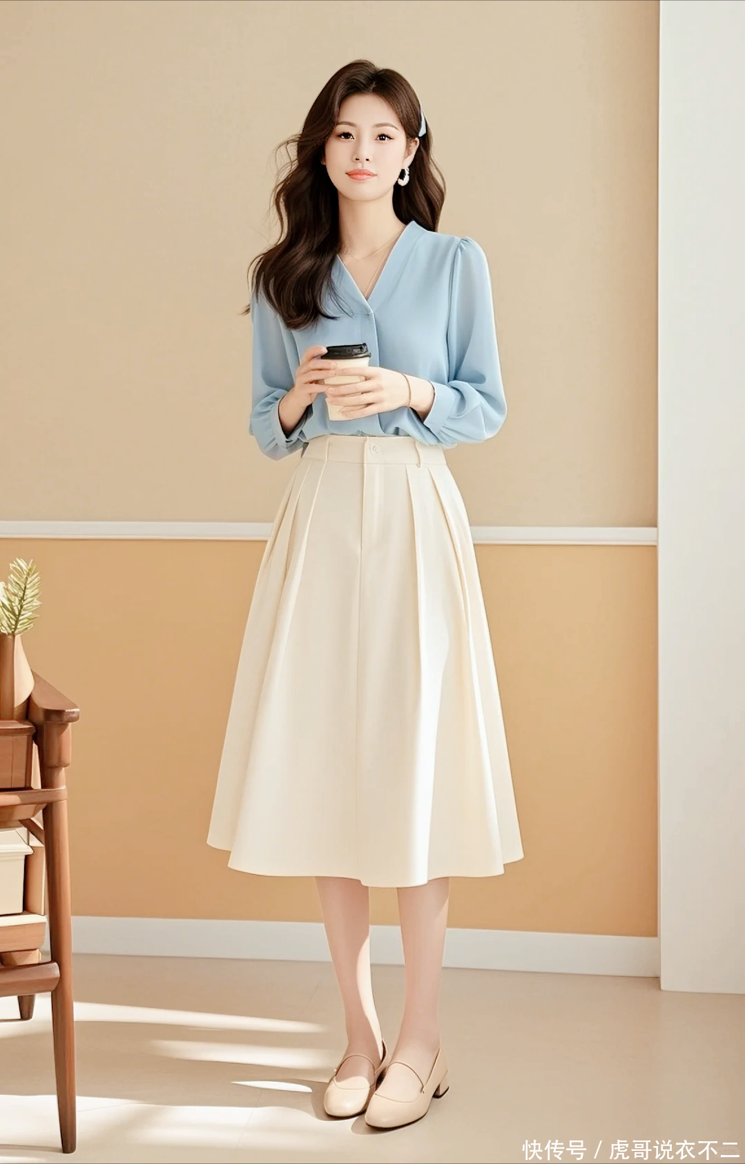 浅蓝色的上衣也是不错的选择。V领设计能够拉长颈部线条,显得脸更加小巧。宽松的泡泡袖则能遮盖手臂上的赘肉,达到显瘦的效果。搭配米色高腰半裙的收腰设计,更是巧妙地提升了腰线,轻松塑造出修长的身材比例。