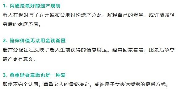 这样的遗产分配往往引发家庭争议。从法律角度看,这是遗嘱自由权的体现;但从情感角度,亲生子女难免感到委屈和不公。或许我们可以从中得到一些启示: