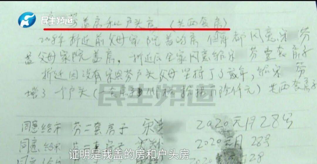 宋女士表示,2002年自己从河南安阳嫁到广东,每年暑假都会带孩子回来看望长辈,老人生病住院,自己也会出钱。2000年的时候,父亲曾写过一个证明:同意给宋女士两套房子,这两套房子的盖房钱和户头钱都是宋女士出的,并且上面也有父母以及三位哥哥的签名和手印。
