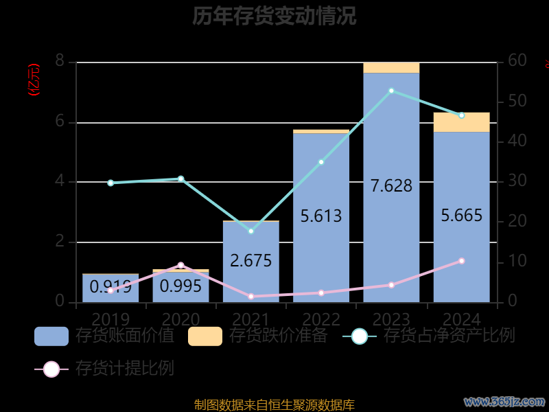 从存货变动来看,截至2024年末,公司存货账面价值为5.67亿元,占净资产的46.61%,较上年末减少1.96亿元。其中,存货跌价准备为6498.37万元,计提比例为10.29%。